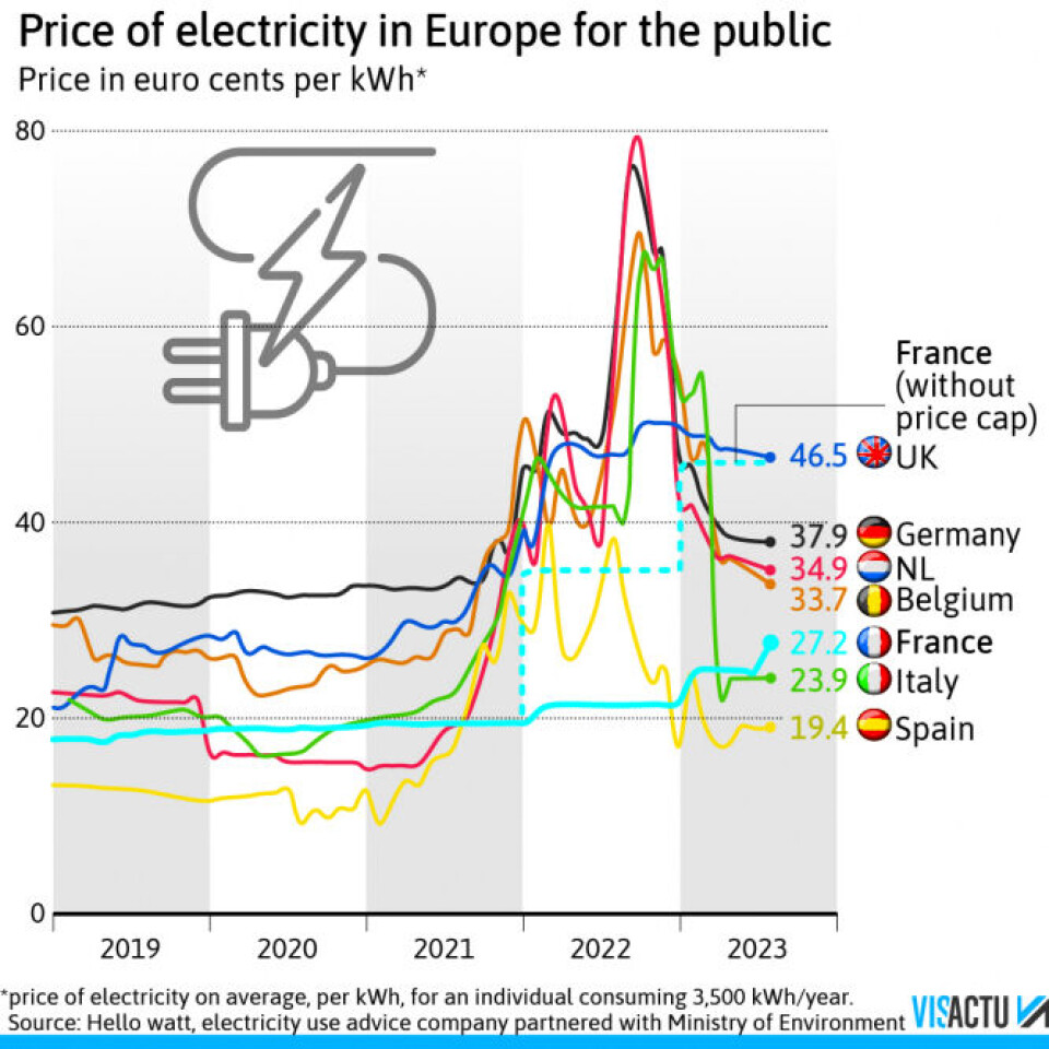 The company Hello watt, which specialises in electricity use advice and is partnered with the French ministry of the Environment, estimates that without this cap, French prices would be equivalent to those in the United Kingdom, which are currently the highest in Europe.