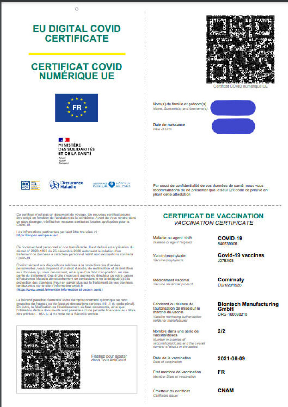 See below an example of an updated Covid-19 vaccination certificate issued in France that is compatible with EU travel.