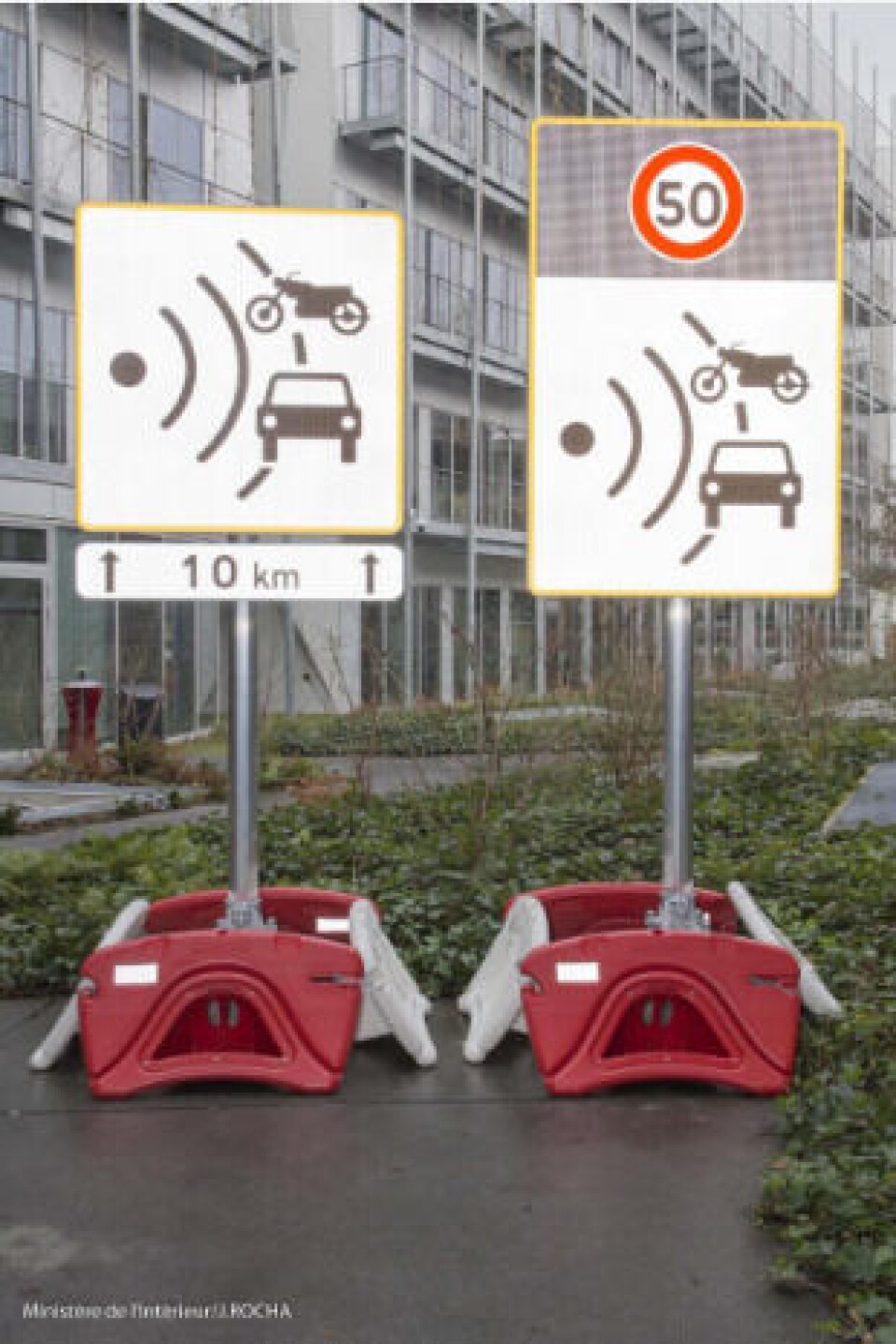 Sécurité routière stated: “The outer yellow border has been maintained to ensure contrast and visibility, as well as the black pictograms on a white background symbolising [radar] waves moving towards a motorbike or car.”