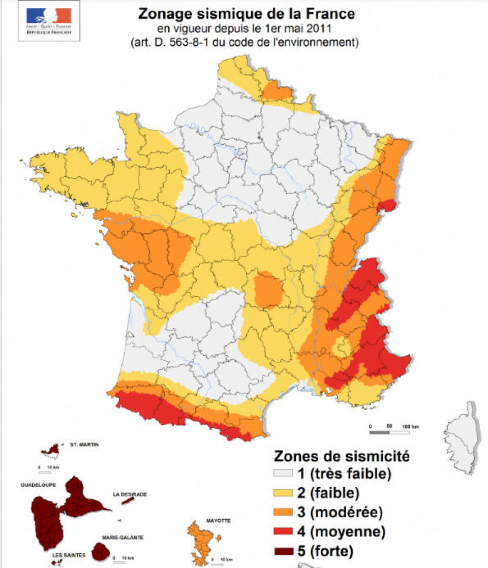 The French government published a map in 2011, which is still valid and addresses the risks of earthquakes in France and the overseas territories using a 1-5 scale. Level 1 means the earthquake risk is very low and level 5 means there is a high risk.
