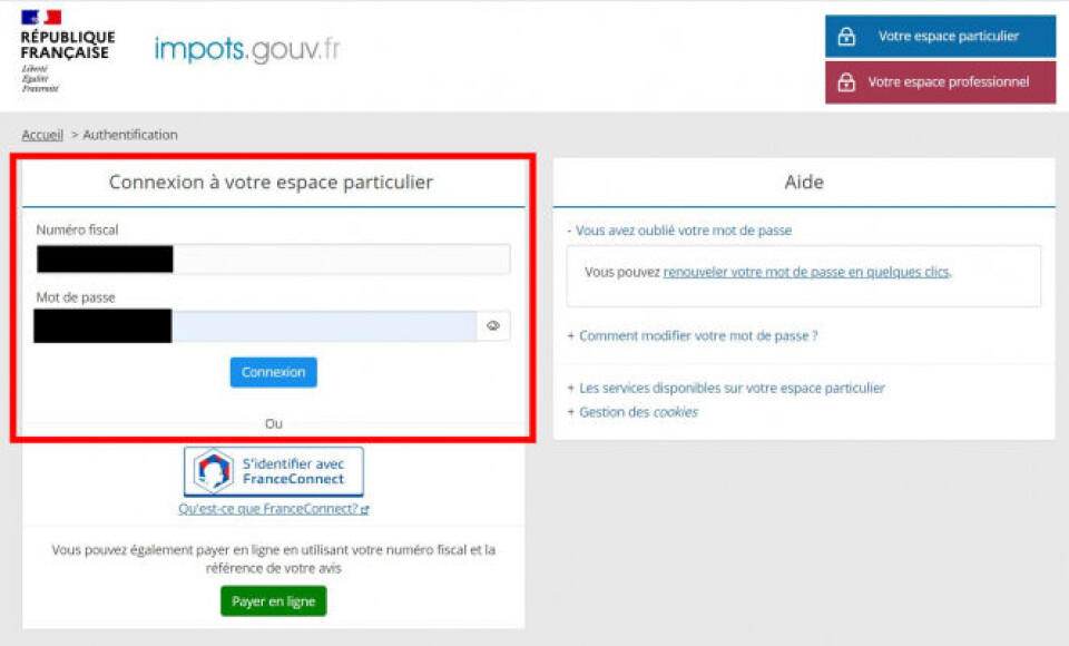 Step two: Log into the space using your numéro fiscal and password. If you do not have a numéro fiscal, read our guide here about this.