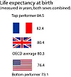 People in France are some of the longest-living people among the OECD countries, ahead of the UK, US and the general average. The OECD's report gave a French average of 82.4. Japan is the best, and Latvia the worst, in the OECD.