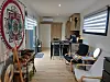 “Where the two sections meet, I added a utility room and I included a small office space in the bedroom module. The front section is both a living area and treatment space, with a small kitchen that I can screen off.”