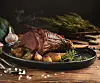 It is surrounded on the baking dish by potatoes and seasonings such as garlic, wine, and herbs, resulting in extremely tender, fall-off-the-bone meat.