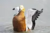 Next time you are looking at a few ducks serenely floating about on a lake, you might catch something like this brightly coloured male Ruddy Shelduck (tadorne casarca) rising up vertically on the water and flashing his finery in the direction of a female.