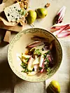 This is one of our favourite salads during the autumn and winter months, when vibrant greens make way for pale chicories in beautiful yellow and wine-red shades. It’s a good example of France’s love affair with endive, which is readily available here all winter long and served in simple salads, or often braised or roasted. We love dressing the raw leaves with a classic French vinaigrette, using either white wine or red wine vinegar, and pairing it with crisp sliced pears and lightly toasted walnuts. For a meal on its own, we add crumbles of salty Roquefort.