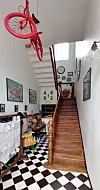 The original architectural elements are enhanced by thoughtful decorative touches such as oversized blackboards, old games and period teaching maps. While their children are not really aware of their home as a former school, they do sometimes use the maps and draw on the blackboards.