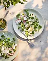 3. Remove the pan from the heat and scoop out the chicken breasts from the poaching liquid. Slice or tear the chicken, serve with the broad beans, watercress, radishes and a drizzle of salsa verde.