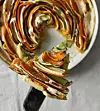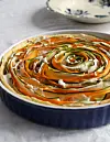 4. Spread the tart crust with the mustard. Starting from the outside edge and working in, arrange the courgette and carrot strips upright and alternate in a circular pattern on top of the crust. If using cheese, add it now, using it to fill the gaps. Gently brush the top of the tart with olive oil and bake for 30 minutes.