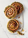The recipe makes eight pistachio-chocolate swirls, requiring an active time of two hours, a bulk fermentation time of 30 minutes, 45 minutes to an hour of resting time, two hours of proofing and 22-25 minutes of cooking time. They can be stored for up to 24 hours.