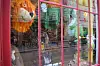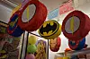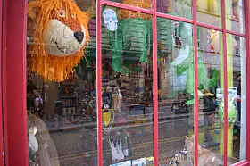 The shop’s name is painted in green on a floral background and its red front door is adorned with balloons. The inside is similarly vibrant, with all sorts of animals and fictional characters hanging from the ceiling.