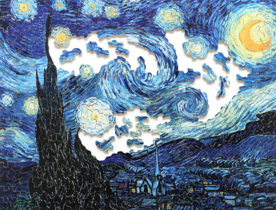 Instead of being uniformly stamped out by machines, each puzzle is cut using a scroll saw by an artisan who does not work to a plan.