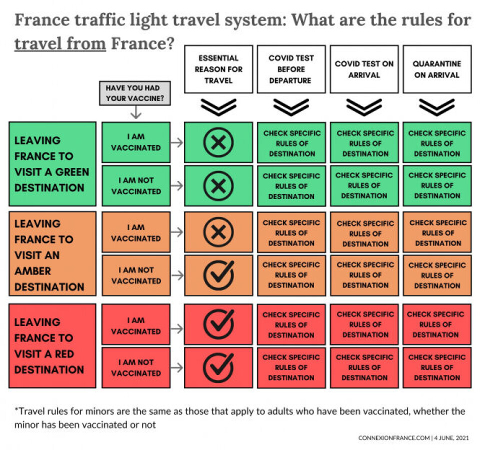 See below our checklist for requirements for people travelling to France from green, amber and red countries and people travelling from France to green, amber and red countries.