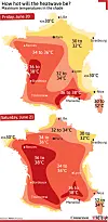 Temperatures of 33C to 35C are also expected as far north as the Loire valley and as far west as Brittany, with Paris, Lyon and Rennes each forecast to reach 32C.