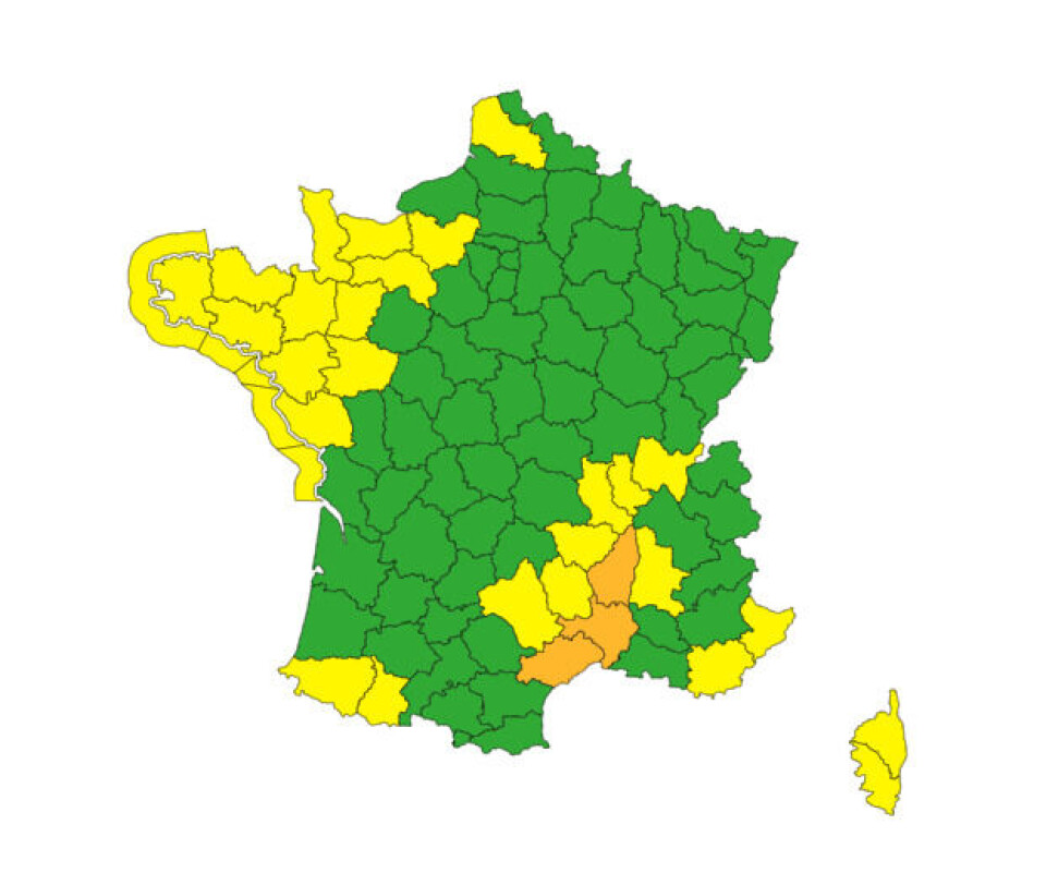 Below is a screenshot of Méteo France’s current warnings. Be aware that some departments have multiple warnings simultaneously in place.