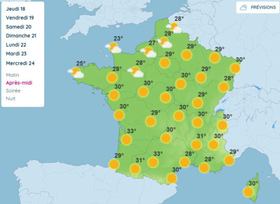 Today’s weather forecast given by Météo-France shows temperature predictions of over 35C in parts of the country from Wednesday next week.