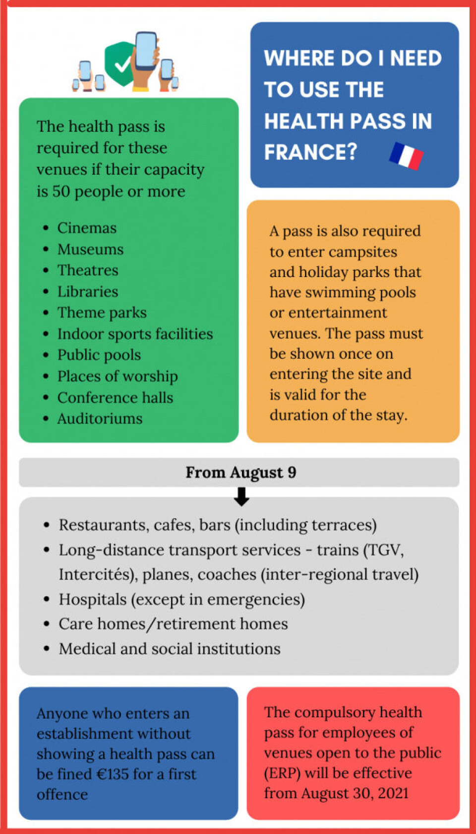 Here is a reminder of where you will need to use the health pass, and key dates: