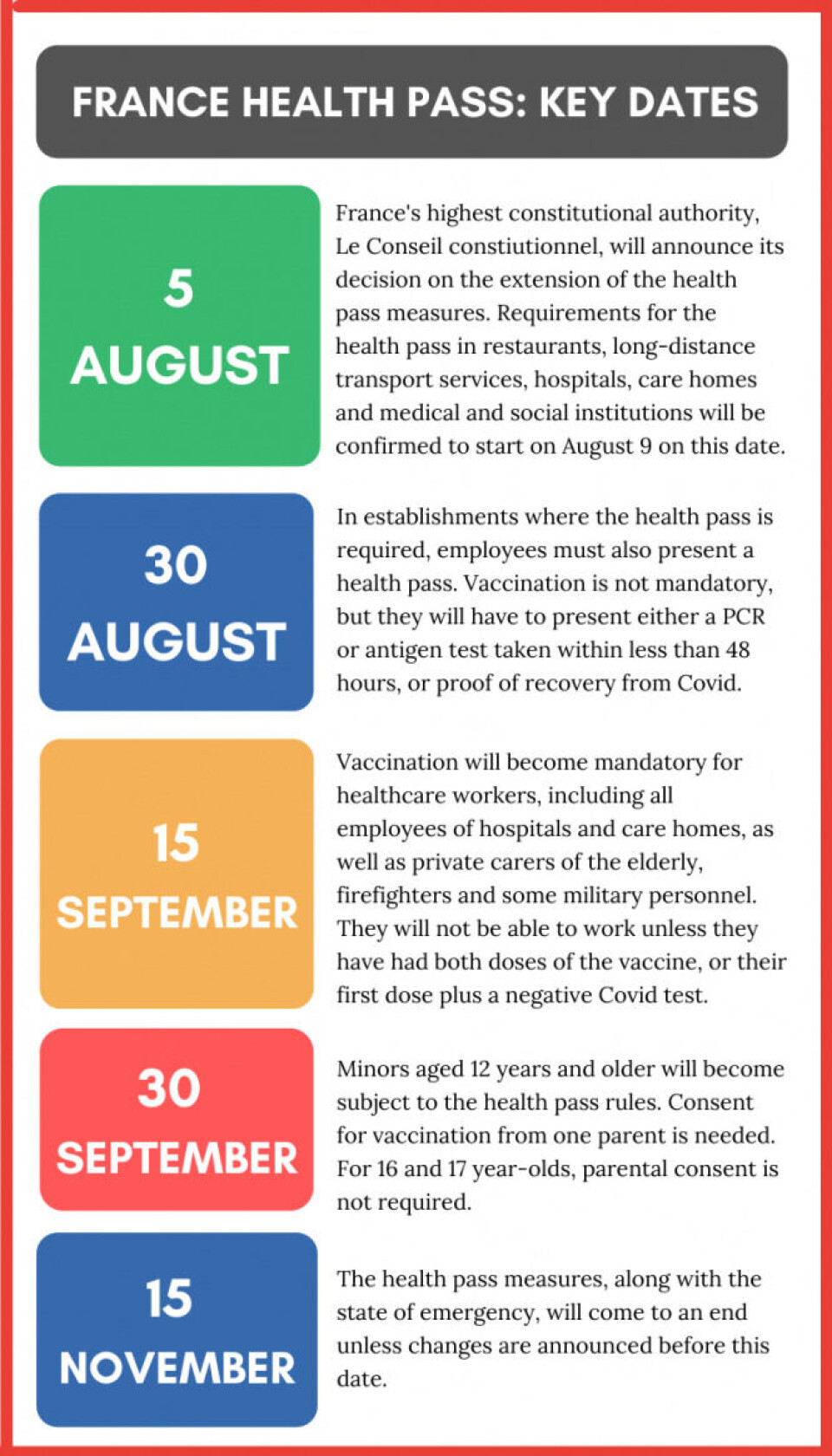 Gabriel Attal said, assuming the new law on extension of the pass is validated by the Conseil constitutionnel, which will give its ruling on August 5, the pass will start to be required in cafés, restaurants, long-distance transport etc from August 9.