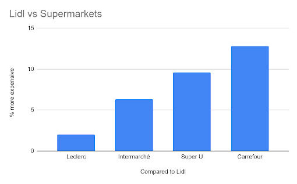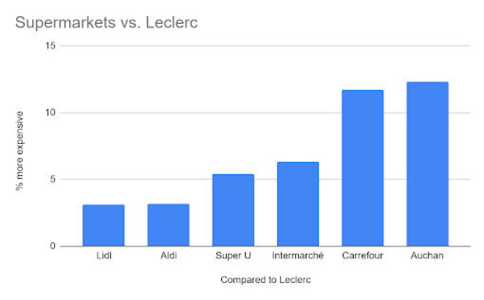 The graph below shows E.Leclerc’s findings, which claims their nearest rival – Lidl – is around 3% more expensive.