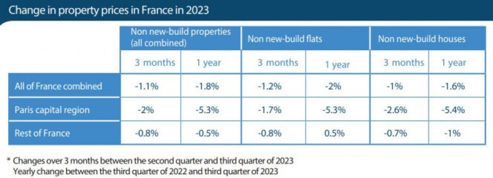 The notaires’ data (July - September 2023) looks at price changes compared with the previous three months as well as the previous year (July-September 2022 - July-September 2023), for non new-build flats and houses.