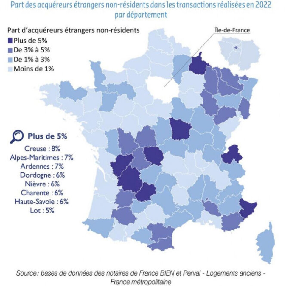 Although only making up 1.8% of property purchases (just over 17,000 sales) in 2022, in some departments almost 10% of people buying homes were non-French people people with their main residence outside France.