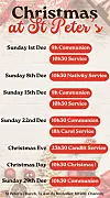 24 December - 5.00 pm, Christmas Eve This is our Crib Service: with prayers & carols, the baby Jesus is placed in the manger. Our final Advent Candle is lit. This is a particularly child friendly service.