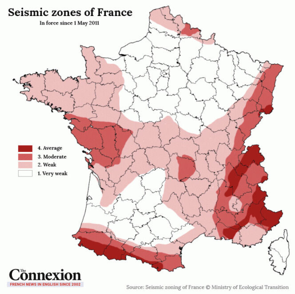 In mainland France no region is marked higher than level four, with level five being reserved for overseas territories with stronger seismic activity.